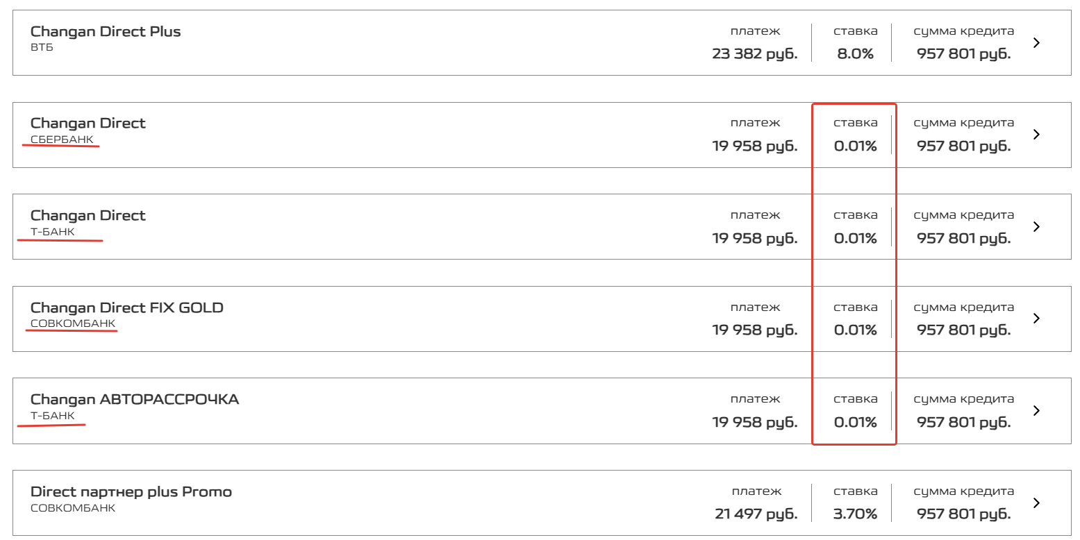 Здесь же можно найти конкретные предложения, в том числе по рассрочке. Как видно, с номинальной ставкой 0,01% годовых машины этого производителя можно купить через Сбер, Совкомбанк и Т-Банк.