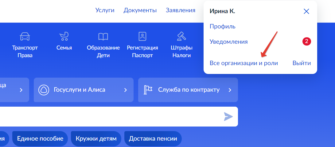 - Кликните по своему имени в правом верхнем углу. Здесь нужно нажать на ссылку «Все организации и роли».