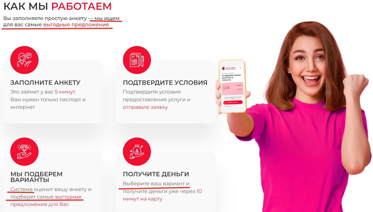 Но если вникнуть в суть текста процесса оформления, становится понятным, что «Малина Займ» не выдает деньги в долг, а занимается подбором микрокредитов.