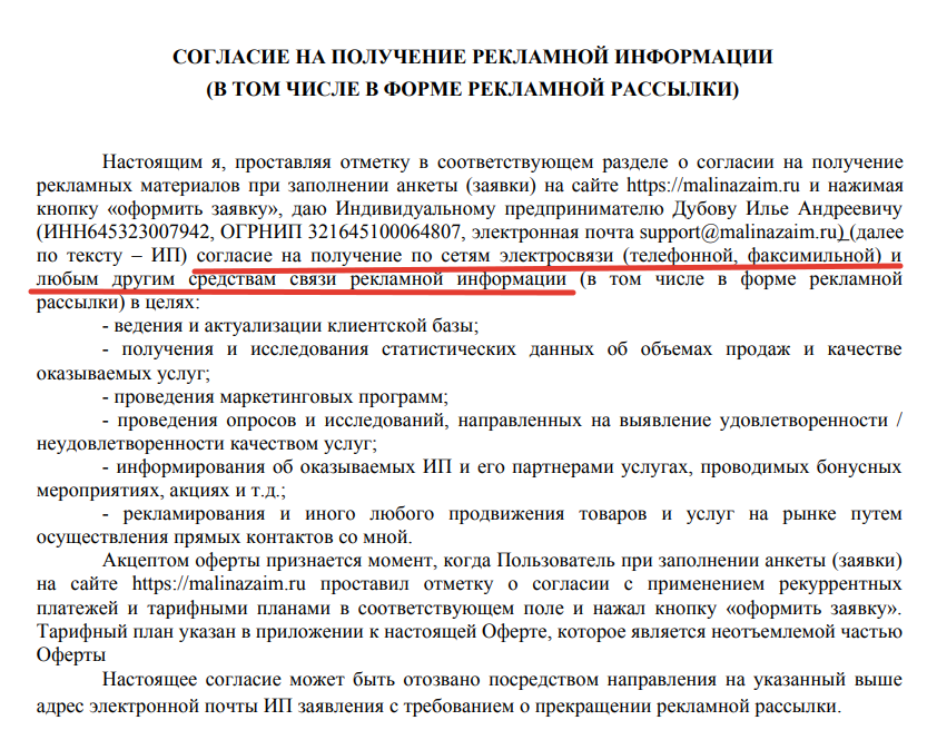 Клиент согласился с получением рекламы от «Малина Займ»