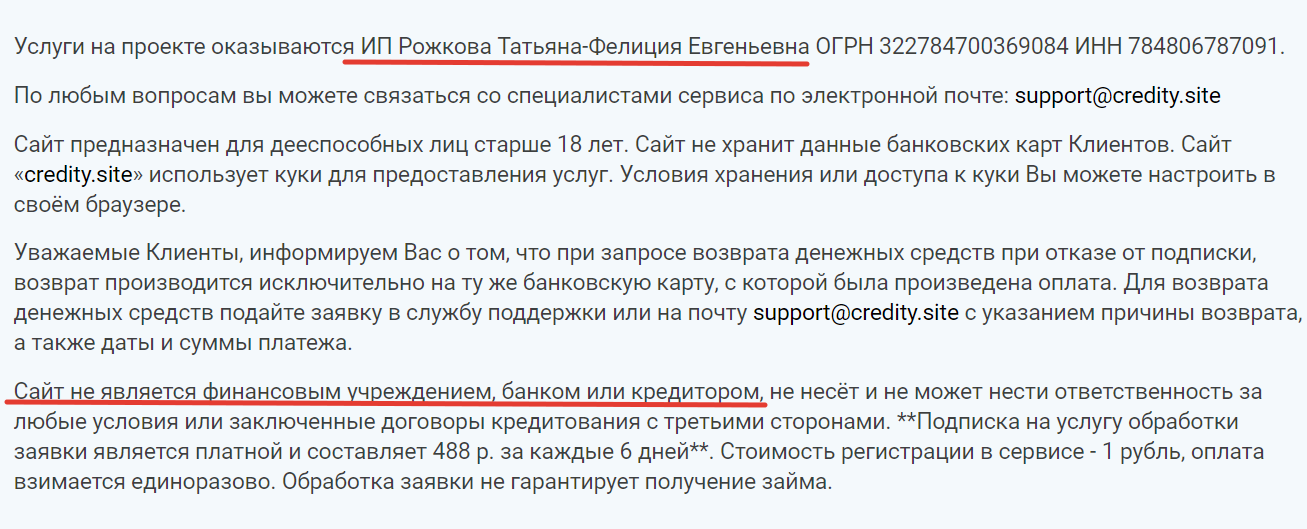 В самом низу сайта указано, что Одобрятор — не кредитная организация. Это ИП Рожкова, которое оказывает посреднические услуги на платной основе. Стоимость услуг сервиса — 488 рублей, которые списывают с карты клиента каждые 6 дней.
