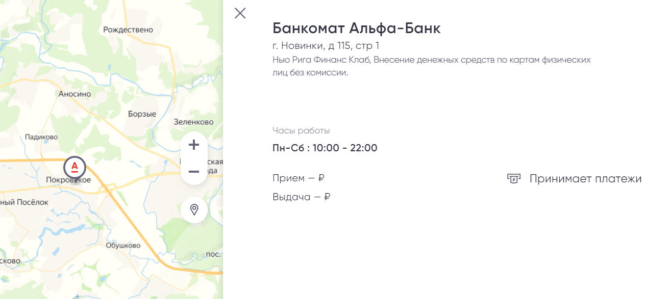 Когда банкомат найден, нажмите на него и увидите подробную информацию: где именно расположен, время работы, какие операции и в какой валюте доступны.
