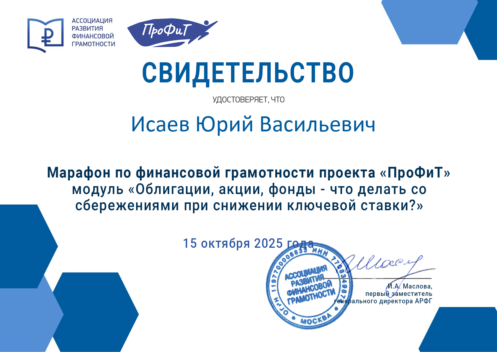- 2025. АРФГ. Марафон по финансовой грамотности: облигации, акции, фонды — что делать со сбережениями при снижении ключевой ставки →