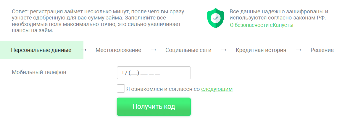 Регистрация в личном кабинете Ekapusta проходит в процессе заполнения заявки на получение микрокредита. Без заявки получить доступ к системе невозможно, так как сервис актуален только для заемщиков и тех, кто намерен получить заем.